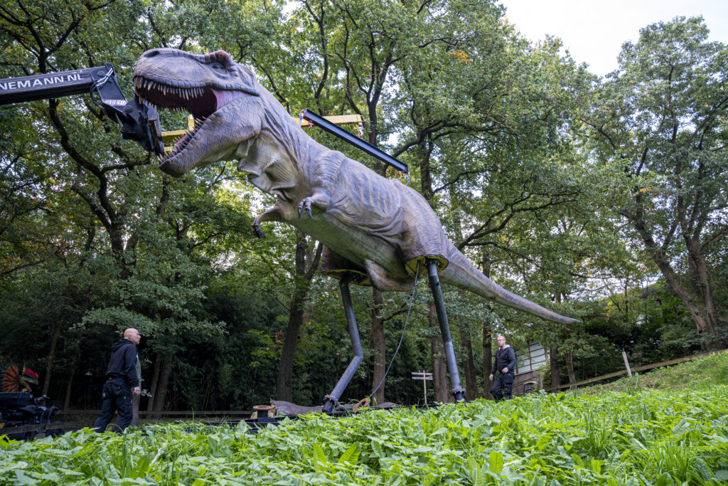 Medewerkers van Burgers’ Zoo plaatsen deze week samen met World of Dino BV liefst 17 reusachtige dinosaurussen verspreid door het park. Een Tyrannosaurus rex van tien meter lang en bijna vier meter hoog vormt één van de blikvangers. Op donderdag 25 september plaatsen en monteren ze het bovenlijf van deze kolos met groot materieel als symbolische laatste hand die aan de voorbereidingen wordt gelegd. ‘Dino’s in de Zoo’ gaat zaterdag 27 september van start en eindigt op dinsdag 4 november 2025.