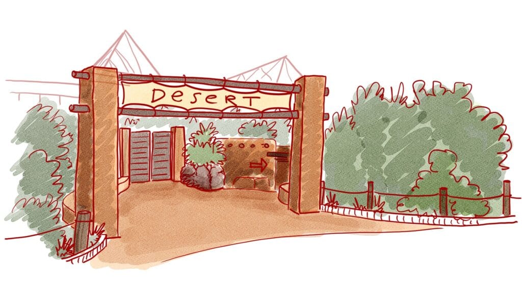 Uit bezoekersonderzoek van Burgers’ Zoo blijkt dat de vindbaarheid en de toegankelijkheid van de Desert niet altijd even hoog scoren. In de huidige situatie ontdekken bezoekers de Desert door middel van een onderaardse tunnel die de Bush met de Desert verbindt. Ter hoogte van het tijgerverblijf in de Rimba verlaten zij de overdekte Amerikaanse rotswoestijn. Het Arnhemse dierenpark legt een nieuwe in- en uitgang naar de Desert aan direct naast het olifantenverblijf. Hierdoor kunnen mensen de Desert makkelijker vinden en bezoeken.