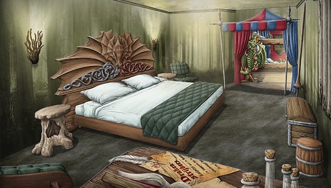 De Joris en de Draak Suite, een ruime penthousetorenkamer voor vijf personen, is ingericht alsof je midden in het moeras staat waar de draak zich schuilhoudt. De groene kleuren, houten materialen en het bijzondere tweepersoonsbed geven de kamer een ruige, mysterieuze sfeer. In het ‘Kabinet der strijdlustigen’ worden vondsten en aantekeningen van vroegere drakenstrijders zorgvuldig bewaard, van schetsen tot mysterieuze drankjes.