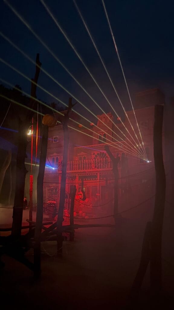 De grootste verrassing van de avond was achterin het park te vinden. Château Cristal was voorzien van lasers en vuur, en zorgde om de zoveel minuten voor een minishow. Het gebied stond vol met rook, de lasers gingen aan, de audio speelde af en dit gebied was in één klap het sfeervolste stukje park geworden. Dit was erg leuk gedaan en zorgde echt voor die typische halloweensfeer die je als bezoeker wilt. Maar daar bleef het niet bij, want ook binnen in het spookhuis Château Cristal kwamen we voor een verrassing te staan. Er is een extra scène bijgekomen! Ik zal proberen geen spoilers te geven, maar vorig jaar was de tweede helft van het spookhuis wat langdradig waardoor ik het huis wat twijfelachtig verliet. Sinds dit jaar hebben ze het dusdanig aangepast dat het totaal niet meer langdradig aanvoelt. Door gebruik te maken van die extra scène voelde het nu als een goede afsluiter van het huis. Ja, ik was echt aangenaam verrast. Vorig jaar vond ik dit spookhuis al de beste van de vier, en door deze aanpassing is die positie alleen maar sterker geworden.