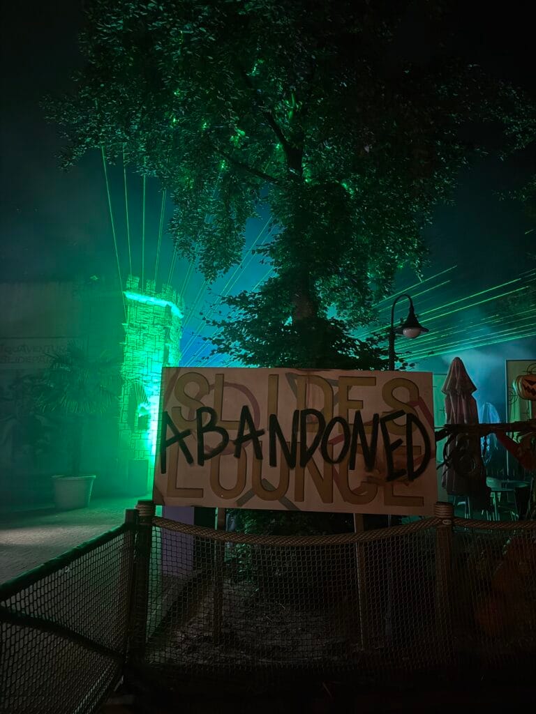 Aan de andere kant van het park was er deze keer meer te doen dan vorig jaar. Langs de wilderwaterbaan liepen freaks rond met scheppen en kettingzagen. Er gaat niets boven de geur van een kettingzaag als Halloween aan de gang is. Maar laat je zeker niet door deze freaks afschrikken, want om de hoek ligt gewoon een nieuw gebiedje bij de ingang van het slidepark. Het park heeft hier de chill zone Abandoned aangelegd. Deze zone is vrij van enge figuren en is juist bedoelt om er te chillen. Met een horecapunt en een terras kan je er even lekker tot rust komen, terwijl een DJ geheel in stijl plaatjes draait.