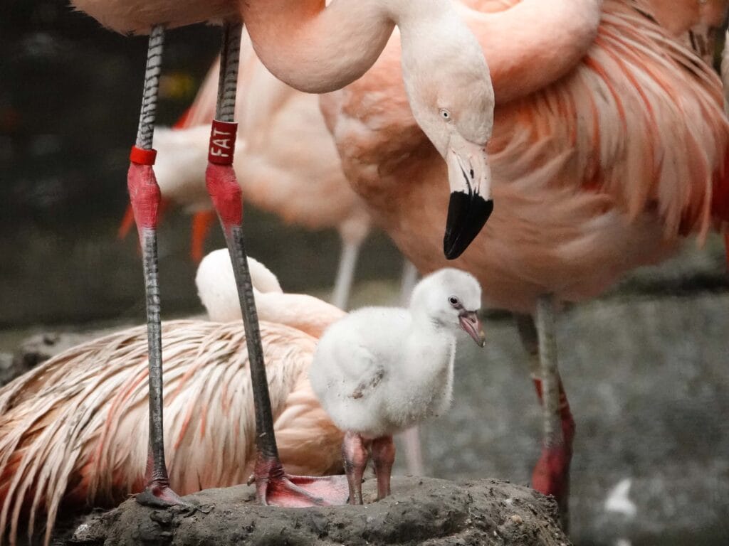 In DierenPark Amersfoort is een Chileens flamingokuiken uit het ei gekomen. Met het jonge vogeltje gaat het goed. “Beide ouders zorgen voorbeeldig voor hun jong,” vertelt dierverzorger Maurits Welkenhuysen. Het donsige kuiken verkent al nieuwsgierig zijn verblijf, heeft een eerste stap in het water gezet en probeert zelfs al – met wisselend succes – op één poot te balanceren. “Dat vraagt nog wat oefening,” lacht Maurits.