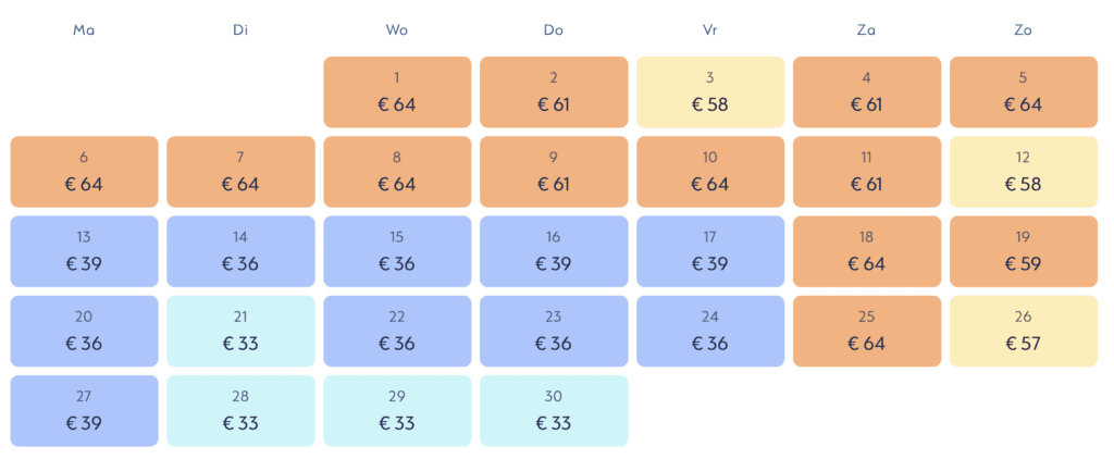 Wie op dit moment een ticket voor april wil bestellen, krijgt met deze prijzen te maken: