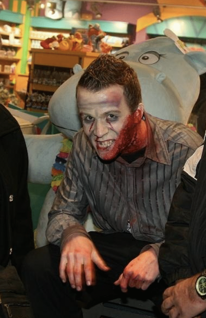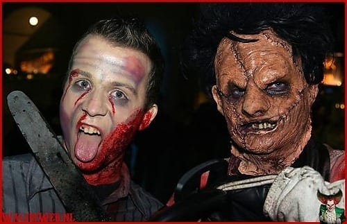 Het evenement was al best professioneel, maar uiteraard nog niet zoals tegenwoordig. Waar ze nu met grimeurs en schema’s werken, moesten we dat toen zelf doen. Je kreeg wel een richtlijn voor hoe je er ongeveer uit moest zien, maar dit mocht je grotendeels zelf invullen. In een gezamenlijke ruimte zat iedereen zichzelf te grimeren, en het meest opvallende was het gebruik van as, afkomstig van sigaretten. Aan alle rokers werd gevraagd om de as te bewaren en mee te nemen, want dit zorgde voor ‘vuile’ wonden. Rode grime met nepbloed was al effectief, maar door het aanbrengen van as werden de wonden donkerder van kleur en zagen ze er smeriger uit.
