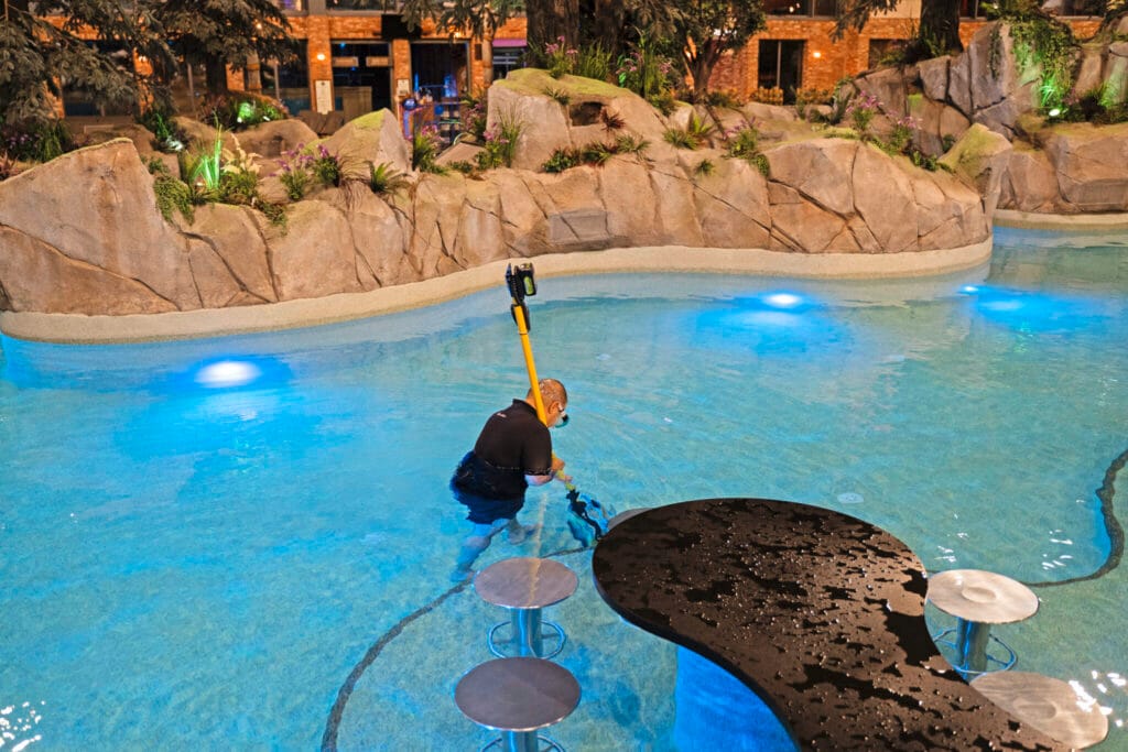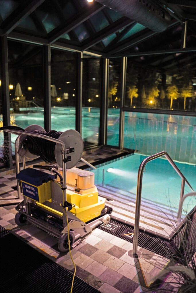 Buiten, bij het Svømmepool, gaat een grote schoonmaakrobot het bassin te lijf. Voor de hoeken waar de robot niet bij kan, springt een collega in het water, uitgerust met zwemkleding, duikbril en een handreiniger. Hij gaat minutieus te werk en controleert het hele bad.
